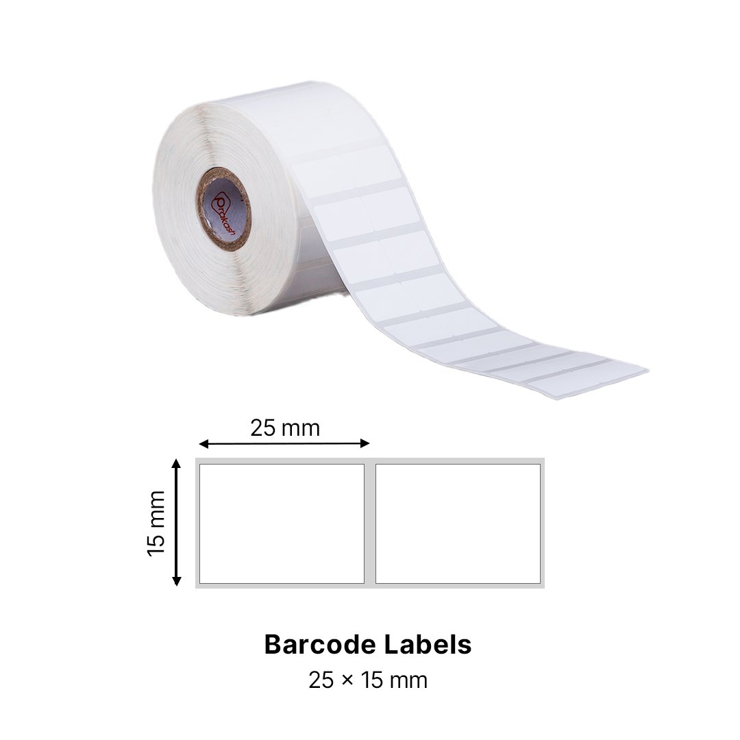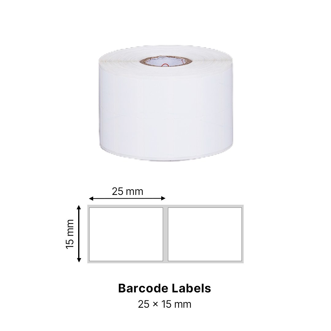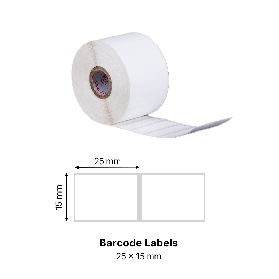 Compact and efficient 25×15mm labels designed for micro-labeling needs. These 1-up micro labels maximize printing density, making them ideal for jewelry, electronics, pharmaceuticals, and other industries requiring precision, high-density barcode labels, and mini product labels.